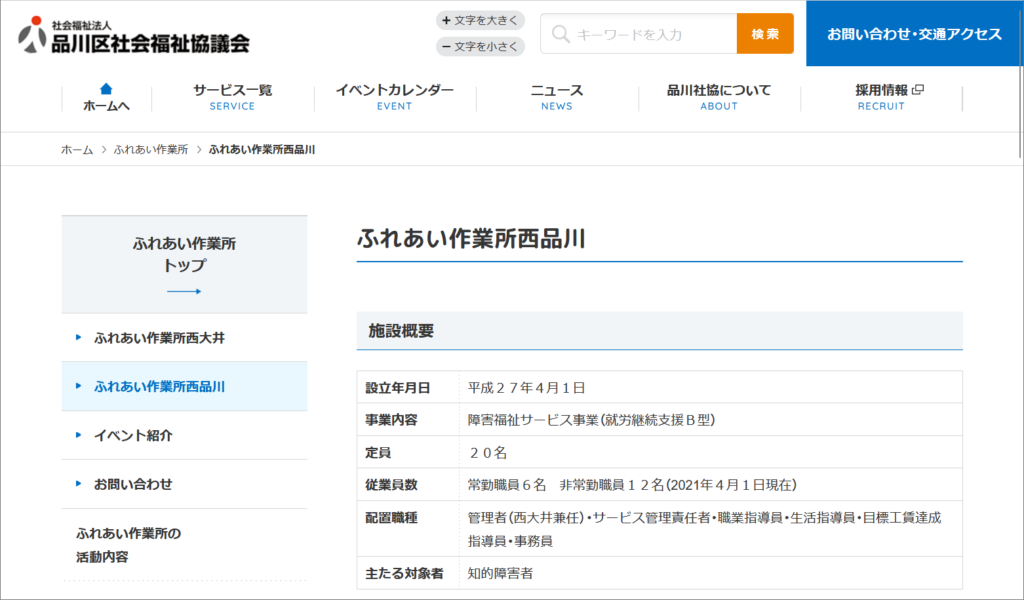 | Webサイト | ふれあい作業所西品川 |