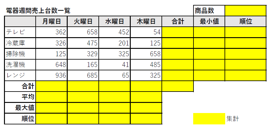 ① 以下の「電器週間売上台数一覧」を作成し、次の問に答えましょう。