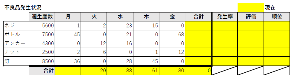 - 発生率欄に商品ごとの不良合計から求められる週生産数での不良品発生率(不良品合計÷週生産数)