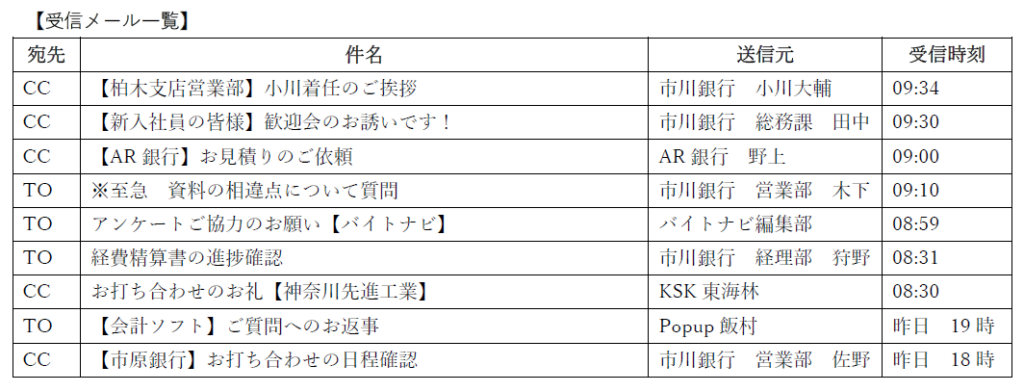 問題1 高田は、市川銀行の新宿支店・総務課に勤務する新入社員です。毎朝出勤するとたくさんのメールが届いており、内容は同僚の挨拶、仕事の依頼、状況確認などさまざまです。下記のようなメールが届いていた時、高田はどのような順番で開封・返信するのがよいでしょうか。正しいと思うものを【解答群】から選びましょう。(複数あります)