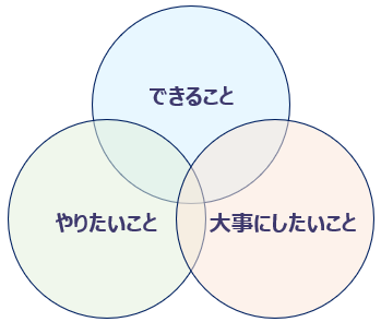図の「できること」「やりたいこと」「大事にしたいこと」に当てはまるものをそれぞれ考えてみましょう!